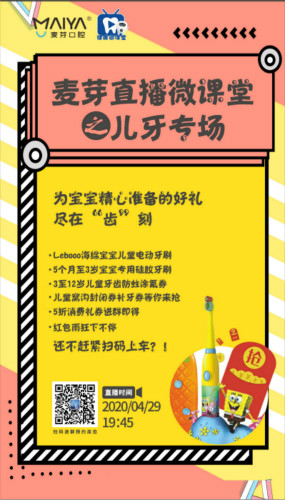 同时,《麦芽口腔健康微课堂》直播第二期儿牙专场也将在4月29日和大家见面,由麦芽硕博专家团成员在线分享口腔知识,其间更有复工暖心洁牙礼券、补牙礼券,群内有微信红包雨不定时放送,参与群互动还能赢免费补牙,日本CI葫芦娃硅胶牙刷,儿童防蛀牙全口免费涂氟,免费儿童全口窝沟封闭以及力博得海绵宝宝儿童电动牙刷等超多福利!心动不如行动,赶紧拨打82339968咨询进群吧!
